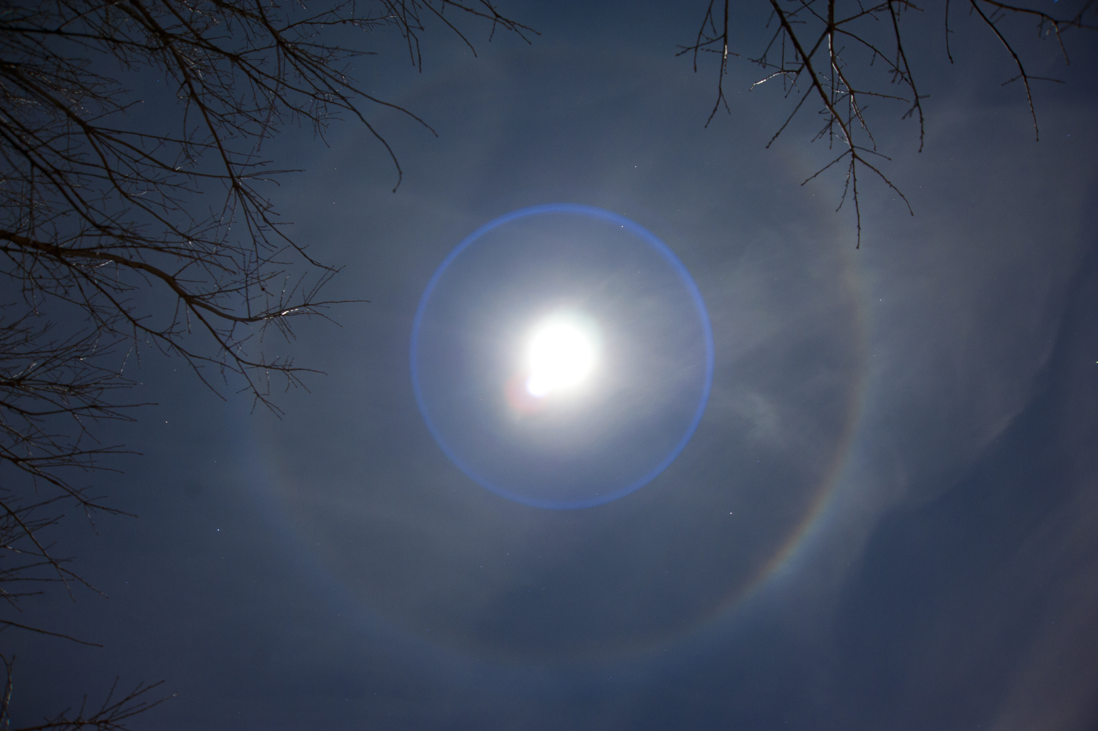 A lunar halo is similar to a rainbow. The light from the moon is split into different colors by high altitude clouds.